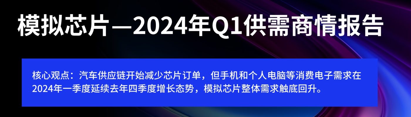 《模拟芯片-2024年一季度供需商情报告》核心观点:汽车供应链开始减少芯片订单,但手机和个人电脑等消费电子需求在2024年一季度延续去年四季度增长态势,模拟芯片整体需求触底回升。