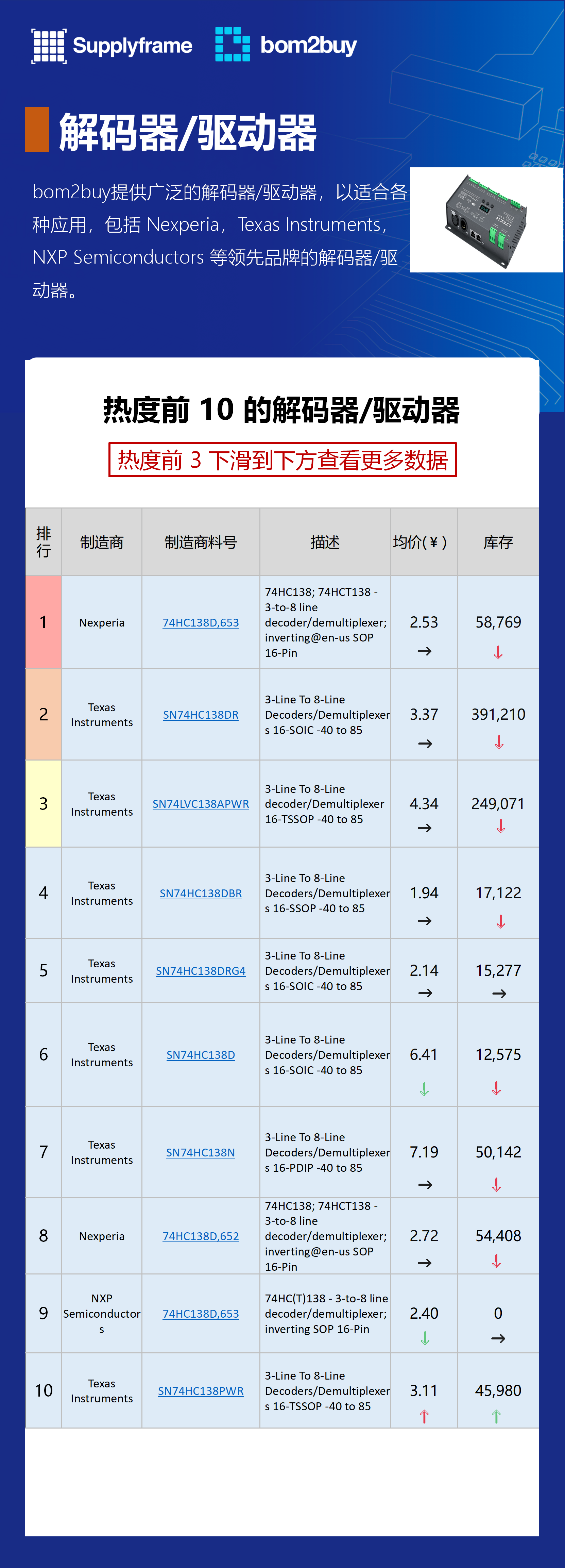 热度前10的解码器/驱动器基本上被Nexperia,Texas InstrumentsNXP Semiconductors等行业大厂所包揽。